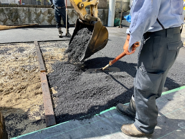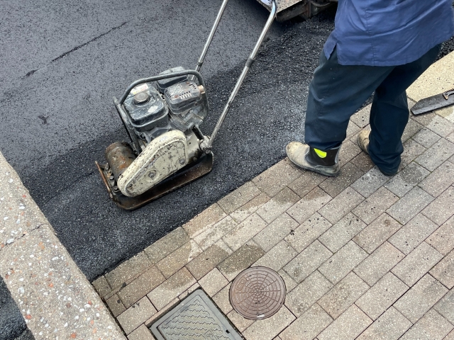 通行量のある道路であったため、施工時間帯を調整し、交通誘導や仮設養生を行いながら作業を進めました。既存舗装との取り合い部分についても丁寧な仕上げを行い、段差や不陸が生じないよう配慮しています。